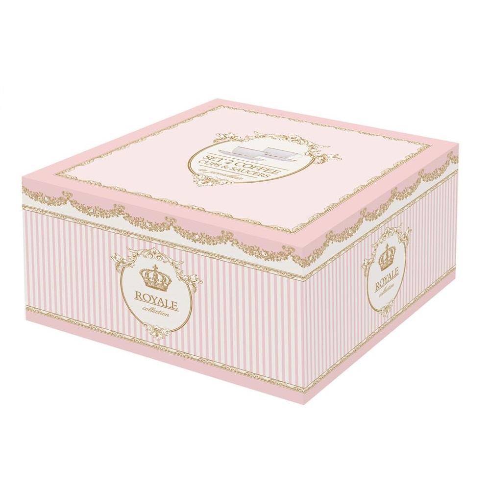 Zestaw porcelanowy składający się z dwóch porcelanowych filiżanek wraz z talerzykami z kolekcji ROYALE w kolorowym opakowaniu. Produkt wykonany ze średniej grubości porcelany, ze złoconymi brzegami. Nie nadaje się do mycia w zmywarce, ani używania w kuchence mikrofalowej. Wymiary: o pojemności 100ml, wysokość: 5 cm, średnica u góry: 8 cm, średnica talerzyka; 12 cm.
